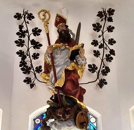 Im Innern der Kapelle sehen wir den Kirchenpatron, den hl. Bischof Theodul. Zu seinen Füssen ein Fass, die sog. Jodernkufe, in der der Wein der Legende nach nie ausging, bis zu dem Tag, an dem neugierige Leute das Gefäss öffneten, um die Quelle des Weinwunders auszukundschaften.