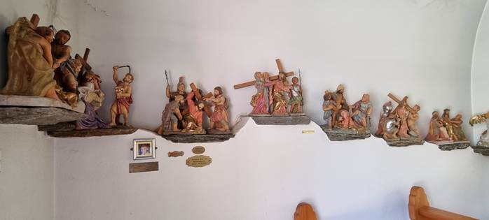 Die Seitenwände sind mit geschnitzten Kreuzwegstationen geschmückt.