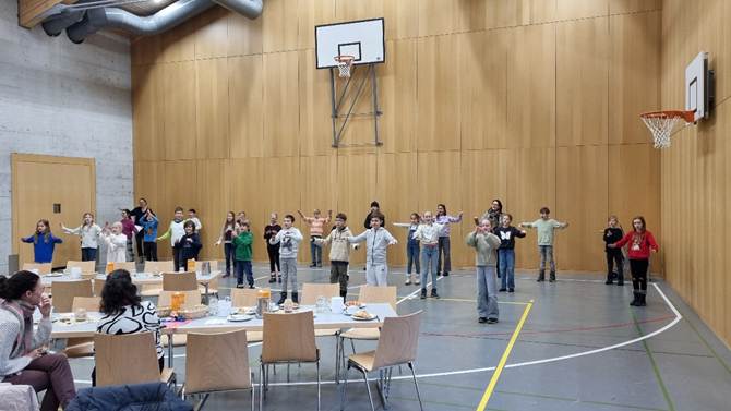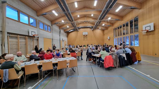 Im Anschluss an den Gottesdienst waren alle herzlich zu einem gemeinsamen Frühstück in die festlich geschmückte Turnhalle eingeladen. Der Pfarreirat empfing die Anwesenden mit grosser Herzlichkeit und sorgte mit Kaffee, Tee und vielen Köstlichkeiten für einen gemütlichen Ausklang dieses besonderen Morgens. In fröhlicher Runde wurde erzählt, gelacht und der Gemeinschaftssinn gepflegt.